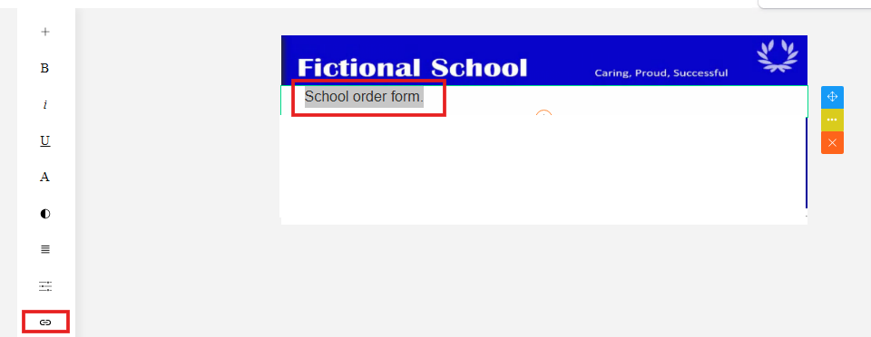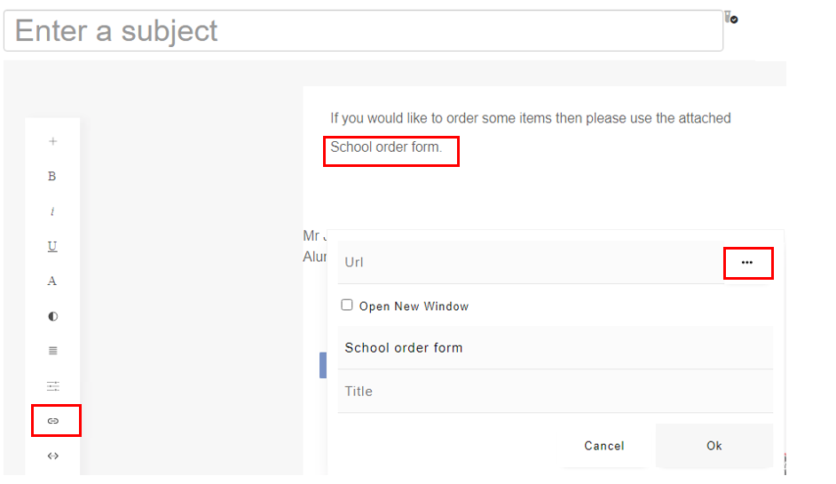 Begin composing your email (see How to Send Group Emails (inc Launch Emails) if you are unfamiliar with this process) and type the text you want to link to the PDF (e.g., School Order Form).