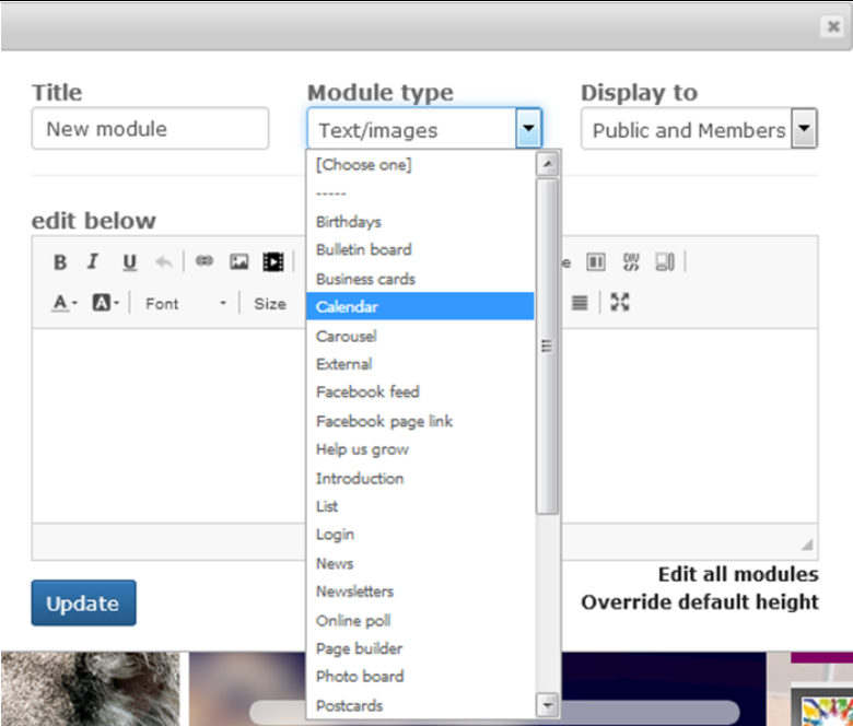 Your home page is the first page that your members will see upon registering onto your database, therefore it is important to make it as attractive and appealing as possible. You have a variety of modules available to help you do this.