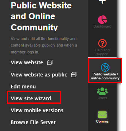 - Go to the Admin Tools menu on the left-hand side of your page > Public website/online community > View Site Wizard.