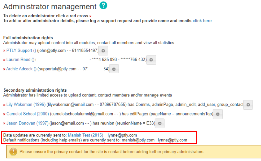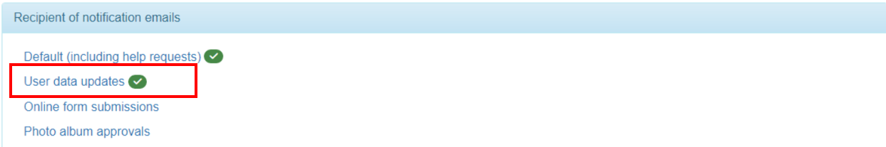 NOTE: If you add a new person into the 'User data updates' field; this will overwrite anyone who was listed previously. Therefore please enter the names of ALL admins that you would like to receive these updates when making any changes to this field.