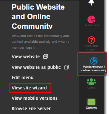 - Go to Admin tools > Public Website and Online Community > View site wizard.