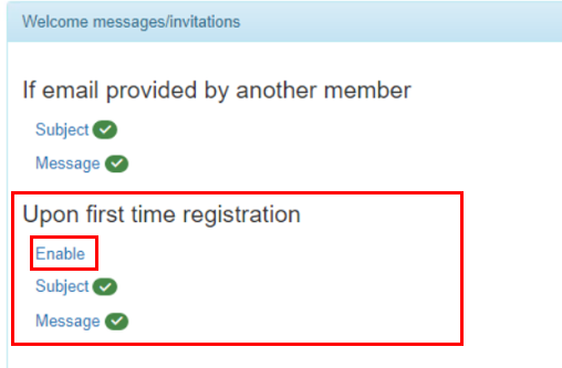 - Go to Welcome messages/Invitations > Upon first time registration.