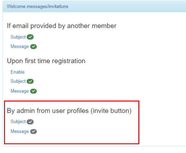You will notice there's a third option called By admin from user profiles (invite button). You can amend the Subject and Message of these emails by clicking on the links highlighted below: