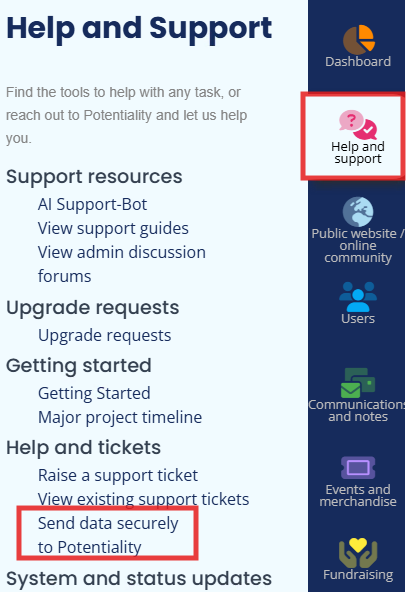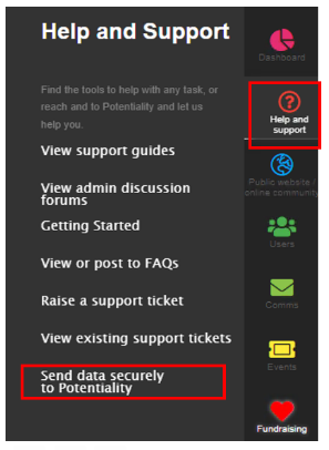 Go to Help and Support > Send data securely to Potentiality via the admin tools menu (found on the left hand side of your screen). See below: