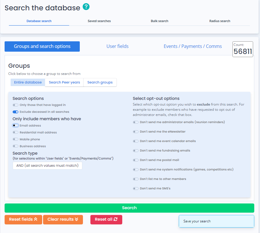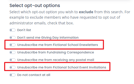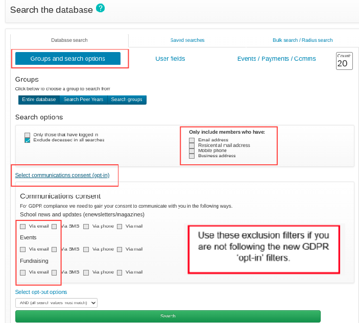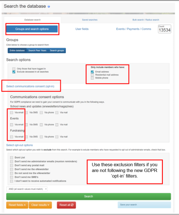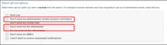 If you have chosen not to follow the 'opt-in' approach above, you MUST tick the relevant filters below from the 'Select opt-out options' instead to ensure that those members who have chosen to unsubscribe from your emails are excluded from your search results, to avoid you inadvertently emailing them by mistake.