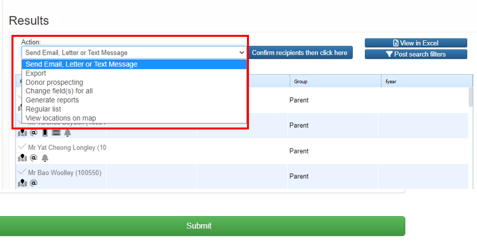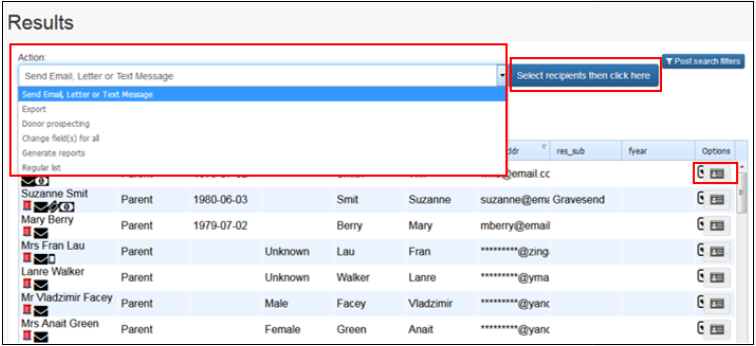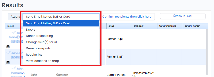 Under the Action menu highlighted above. The default option is Send Email, Letter or Text Message. Therefore there is no need to touch the drop-down menu, simply click Confirm *recipients then click here.*