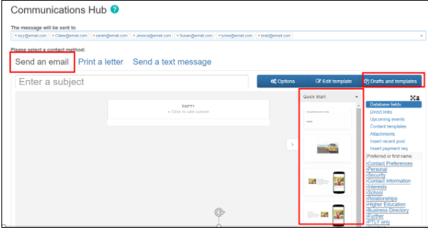 One step is to create a database query; this involves entering the search criteria in order to retrieve the details of those you wish to email and the other is to compose the email within the comms hub.