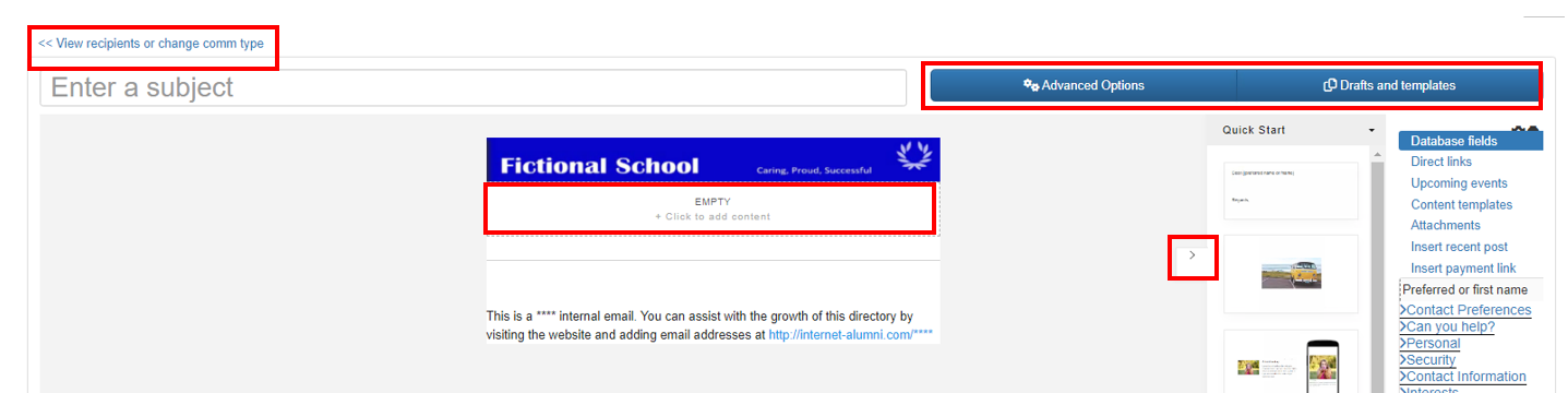 a. Go to Drafts and templates to select an existing email template or draft. You will have advanced options available to you. Please see Advanced email options explained for more information.