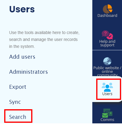 - Go to Admin Tools menu > Users > Search.