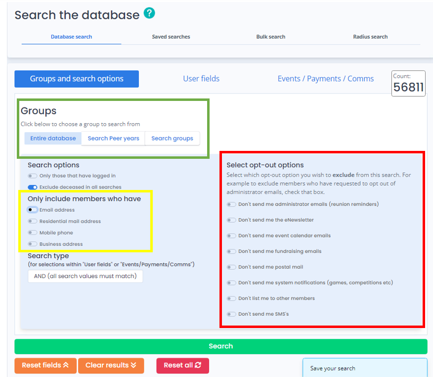 Whether you are emailing the entire database or a small group of people, we would recommend that you select Email address under Search options (highlighted in yellow above). This will filter your search to only include those who have an email address. This is an important step, otherwise, you may believe that you are emailing 5000 members when in fact only 3000 of those members have an email address.