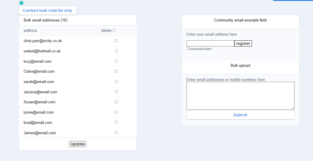 To add multiple email addresses, either enter them manually or copy and paste them into the Bulk Upload box on the right-hand side (using a semicolon or a new line between each email address) and click Submit. These emails will now be available on the Bulk email addresses on the left-hand side of the screen.