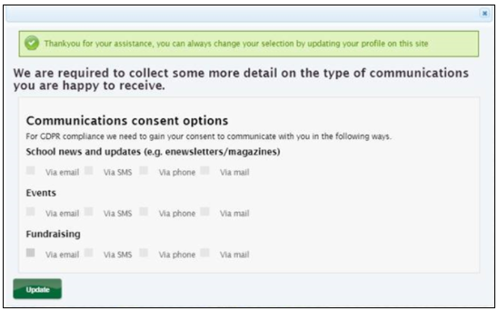 As described above, users are now prompted to provide their consent to the type of communications that they wish to receive from you and their preferences are stored permanently against their profile.