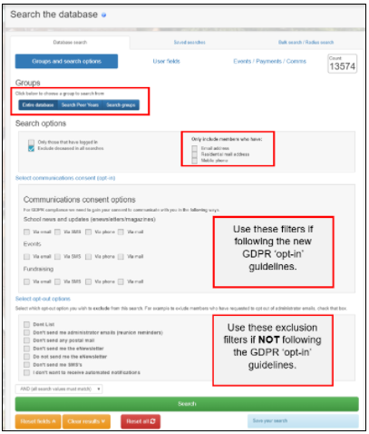 If you have chosen not to follow the 'opt-in' approach above, you MUST tick the relevant filter below from the 'Select opt-out options' instead to ensure that those members who have chosen to unsubscribe from your correspondence are excluded from your search results, to avoid you inadvertently contacting them by mistake.
