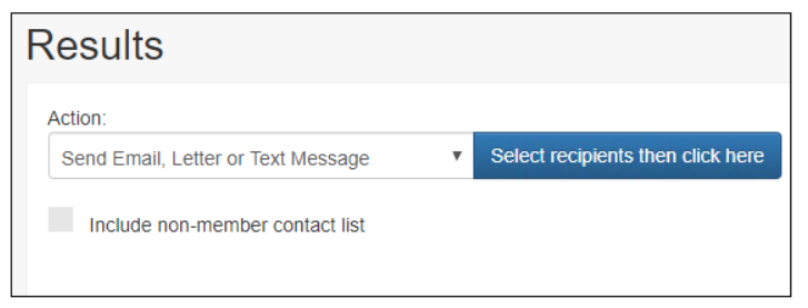 Click Search. At the top of your search results you will see an Action drop-down menu; Send Email, Letter or Text Message is displayed by default.