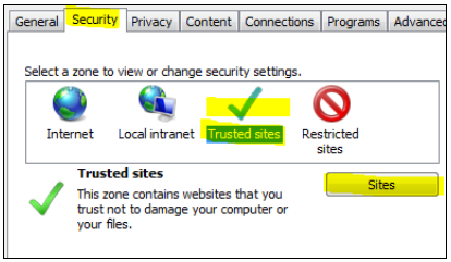 Click the Security tab > Trusted Sites icon, then click Sites.