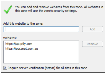 *(NB. You will need to add add both http://ap.ptly.com (UK Clients - use http://eu.ptly.com instead) and your custom domain (for example http://oscanet.com.au ) as shown below. *Untick Require server verification for browser to accept sites running on http.