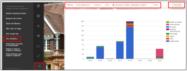 Potentiality offers administrators many different tools to track, build and report upon their data and site activity.